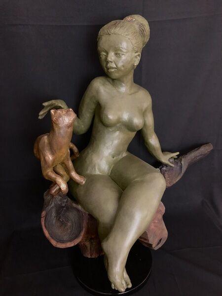 Assise sur un tronc brut, entre la matière du bois et celle de la terre, elle semble appartenir autant à la nature qu’à elle-même. Son corps, modelé avec douceur, s’abandonne à une posture simple, presque familière, tandis que son regard s’échappe ailleurs, dans un monde intérieur que rien ne vient troubler.